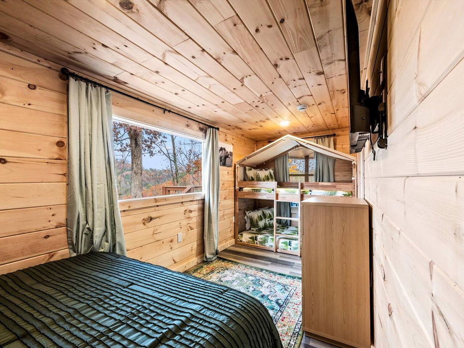 2 Bedrooms: King bed in loft, Queen bed + triangle bunk bed on main floor